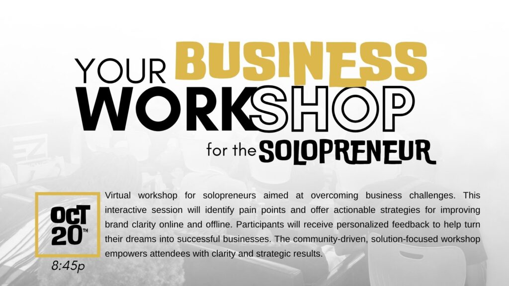 The Your Business Workshop is solution-focused, virtual, and designed for solopreneurs who are doing it all—wearing all the hats, juggling every task, and still figuring out their next move.